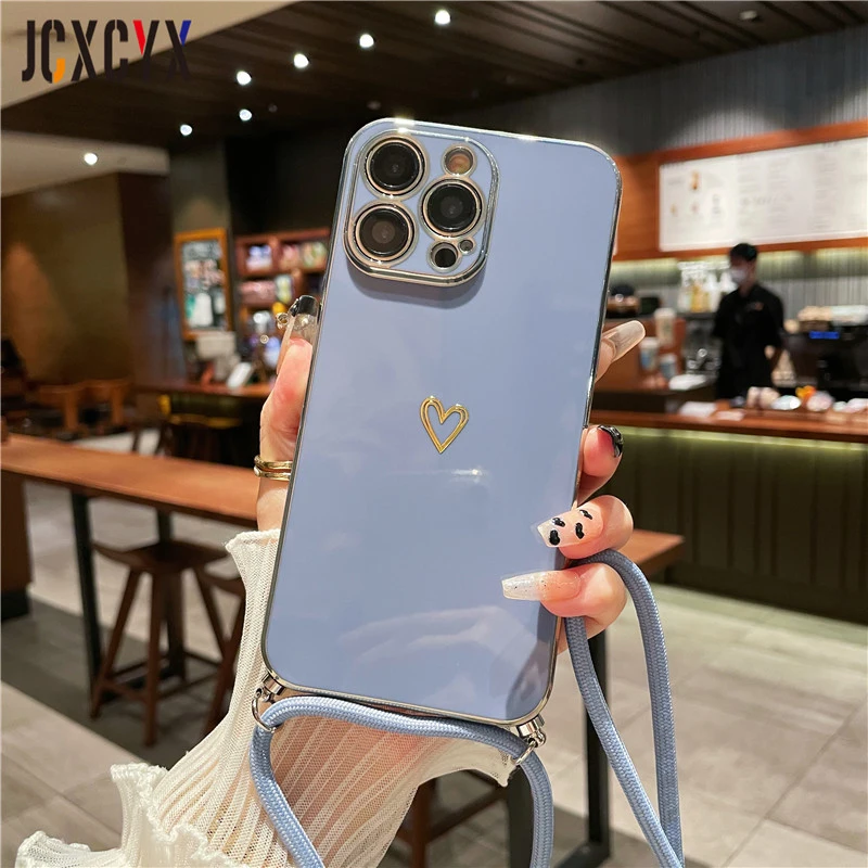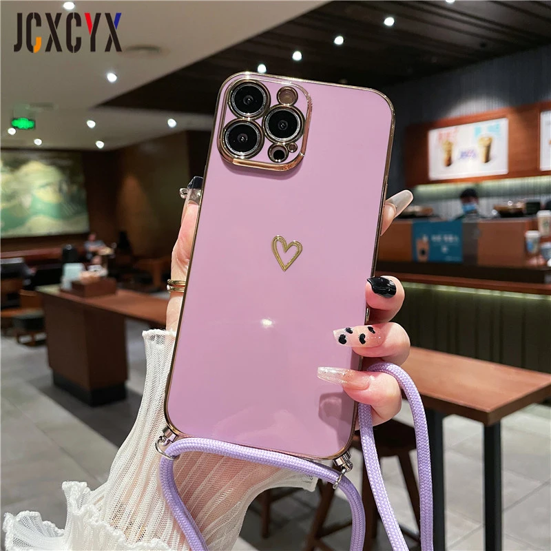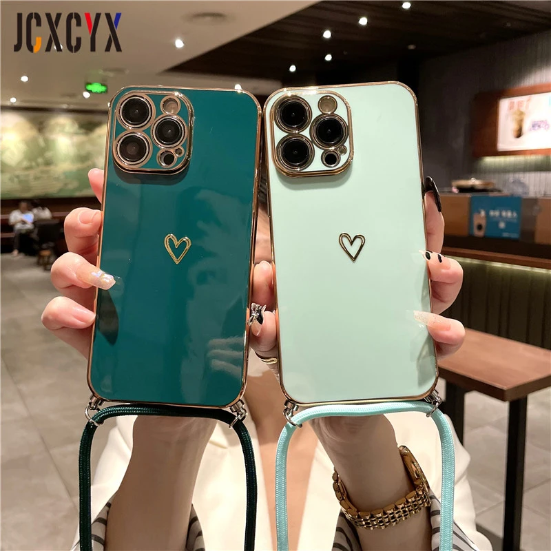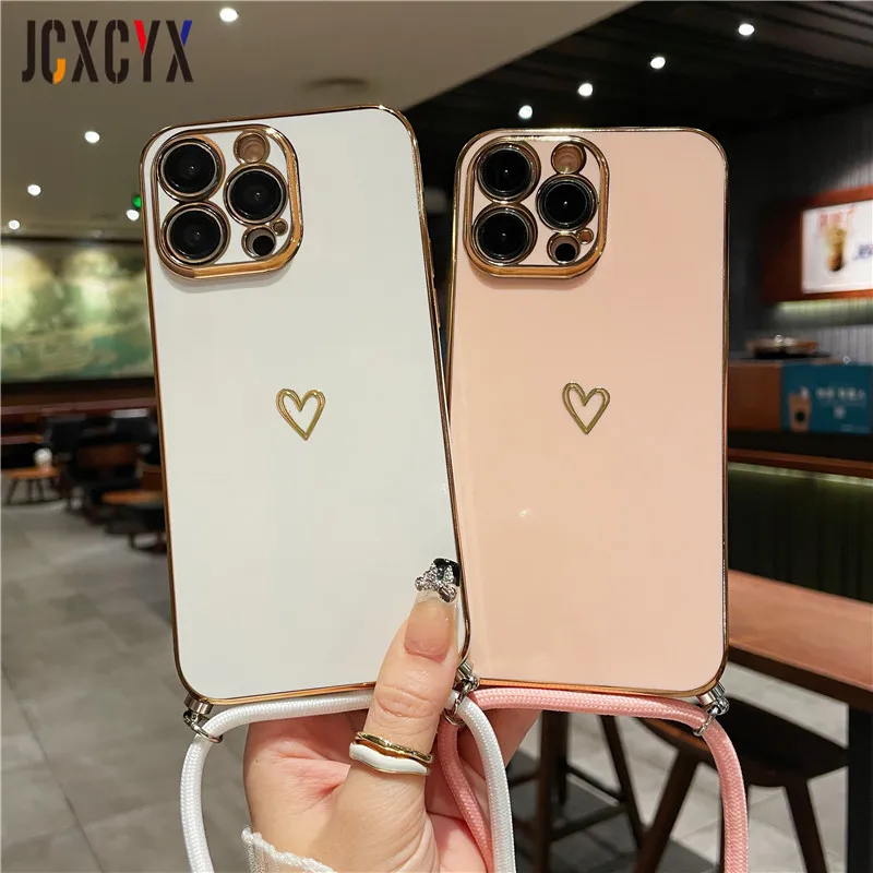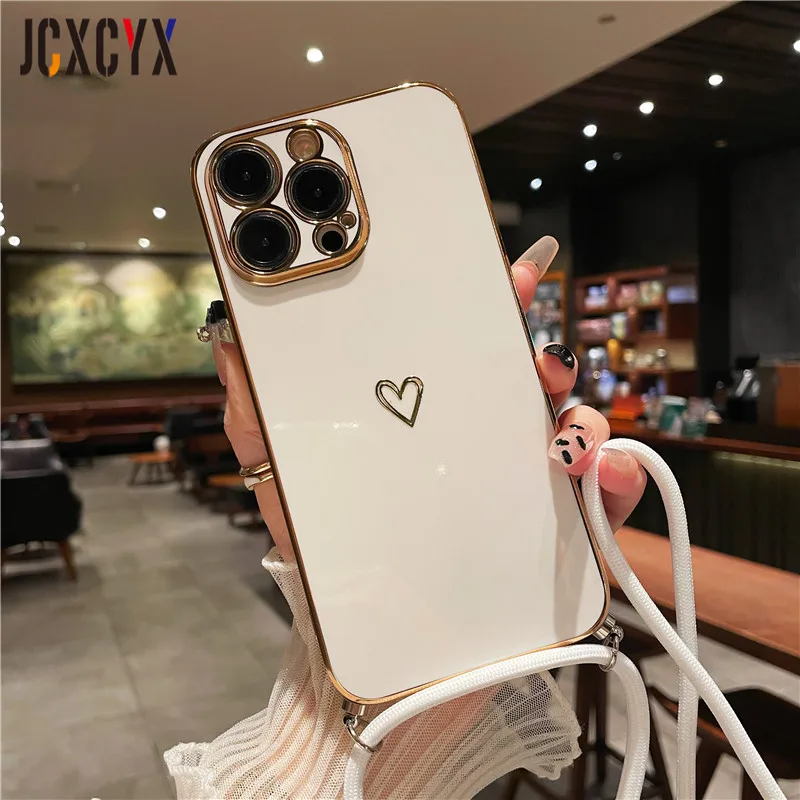 Crossbody Lanyard Cord Plating Love Soft Case für iPhone 14 Pro Max 13 12 11 XS XR 8 7 Plus SE3 MiNi Objektivschutz Rückseite
