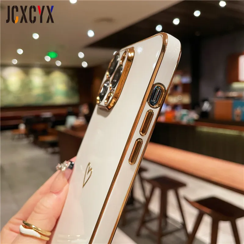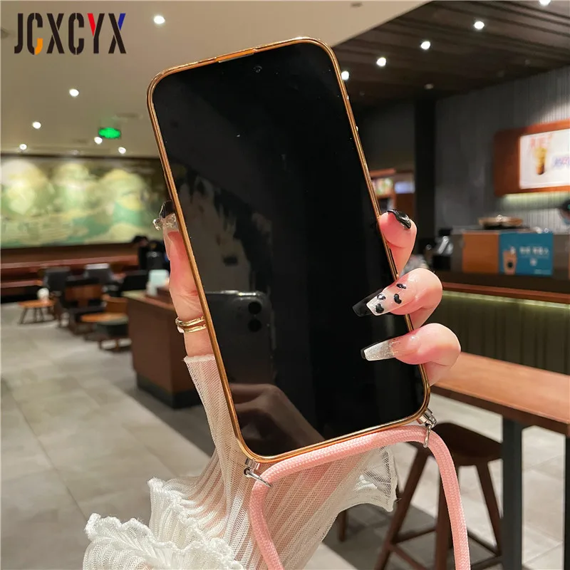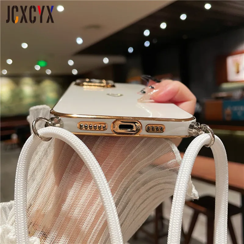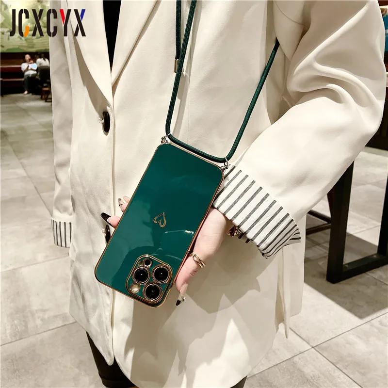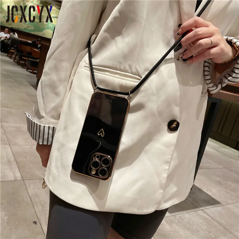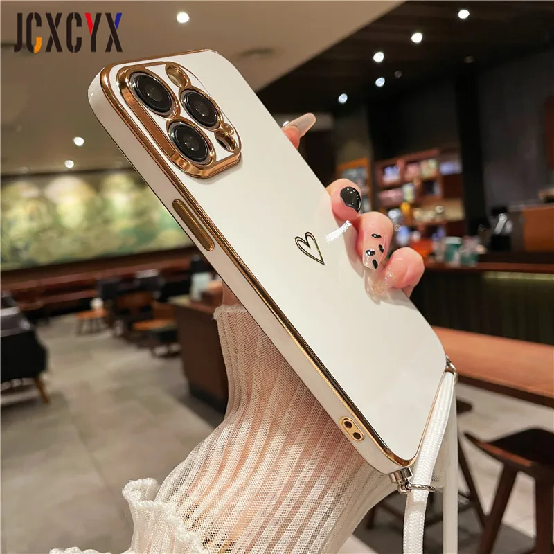 Crossbody Lanyard Cord Plating Love Soft Case für iPhone 14 Pro Max 13 12 11 XS XR 8 7 Plus SE3 MiNi Objektivschutz Rückseite